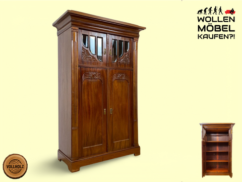 WMK I Vornehmes nordisches antikes Vertiko aus Mahagoni mit facettiertem Glas, handverziert I Schrank Kleiderschrank Wäscheschrank Bücher Vitrine Highboard Geschirrschrank Jugendstil Vintage Berlin