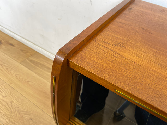 Formschöne kleine Mid-Century Barkommode innen verspiegelt, mit zeittypischen konischen Füßen und Glasschiebetüren