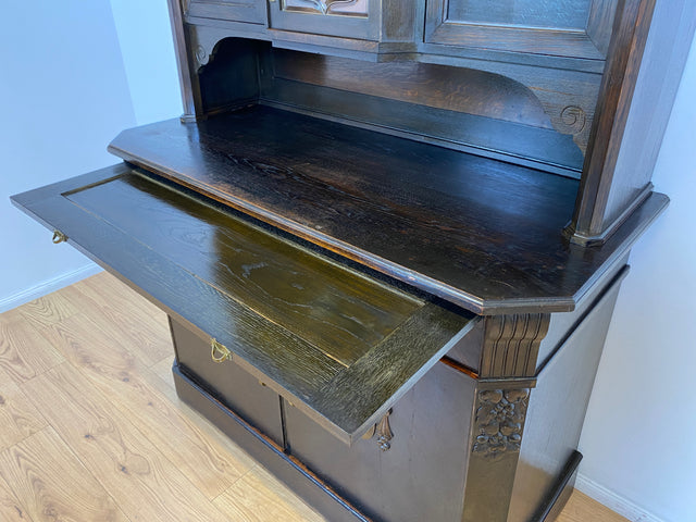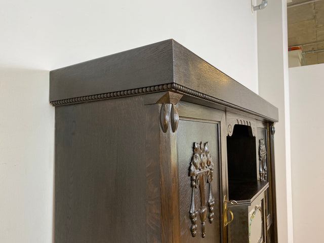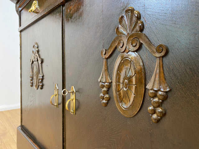 Imposante antike Anrichte aus massiver Eiche mit Messingbeschlägen & facettiertem Glas