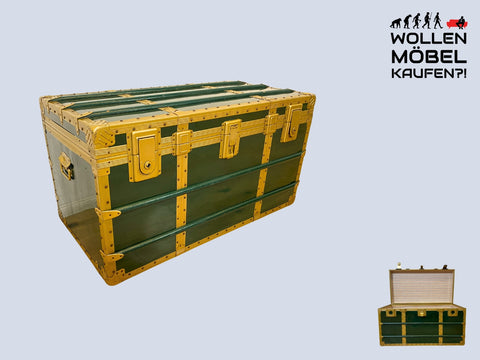 WMK I Besonders schöner grüner antiker Überseekoffer mit Beschlägen aus Metall in Gold I1920-30 I Truhe Koffer Reisekoffer Kiste Schatztruhe Piratentruhe Couchtisch Wäschetruhe I Berlin Hamburg Köln
