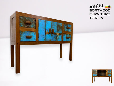 Boatwood by WMK I Meeresblaue Kommode aus altem Bootsholz in Originalfarben mit Schubladen I Teakholz massiv I Schrank Sideboard Garderobe Flurkommode Konsole Teak Bootsmöbel I Köln Hannover Bremen